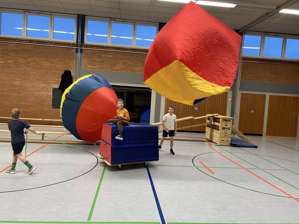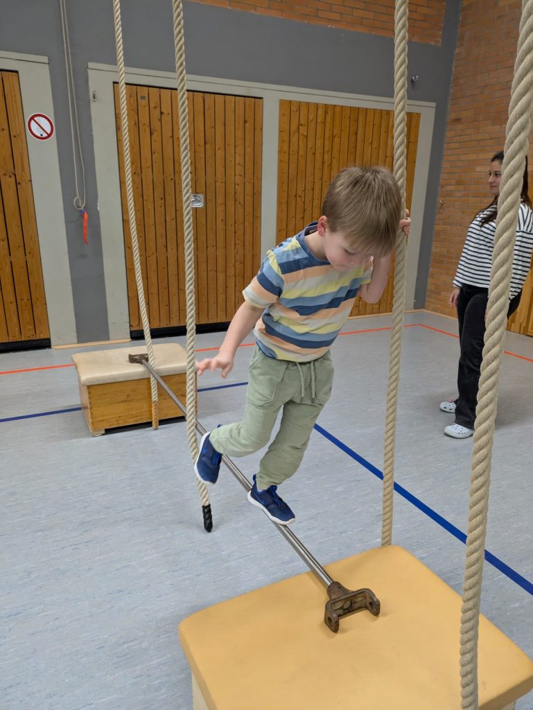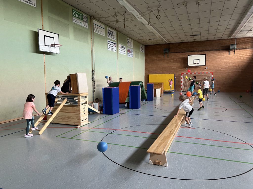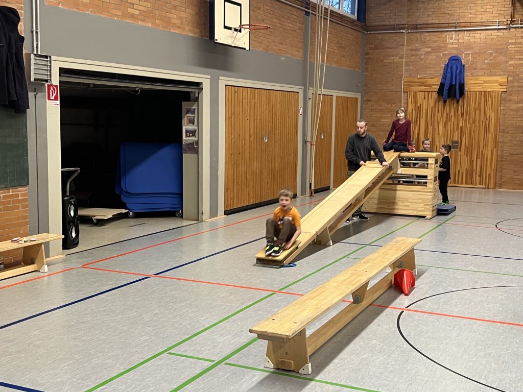 Im Vordergrund steht – Spaß an der Bewegung, daher dürfen die Kids aktiv die Stunde mitgestalten. Die Zeit wird mit Bewegungsspielen, Übungen zum Vertrauen und zur Stärkung des Teamgeistes genutzt. Zudem beschäftigen wir uns mit den Grundkenntnissen des Turnens (Rolle, Handstand, Rad, Werfen, Fangen, Barren, Schwebebalken, Trampolin usw.).